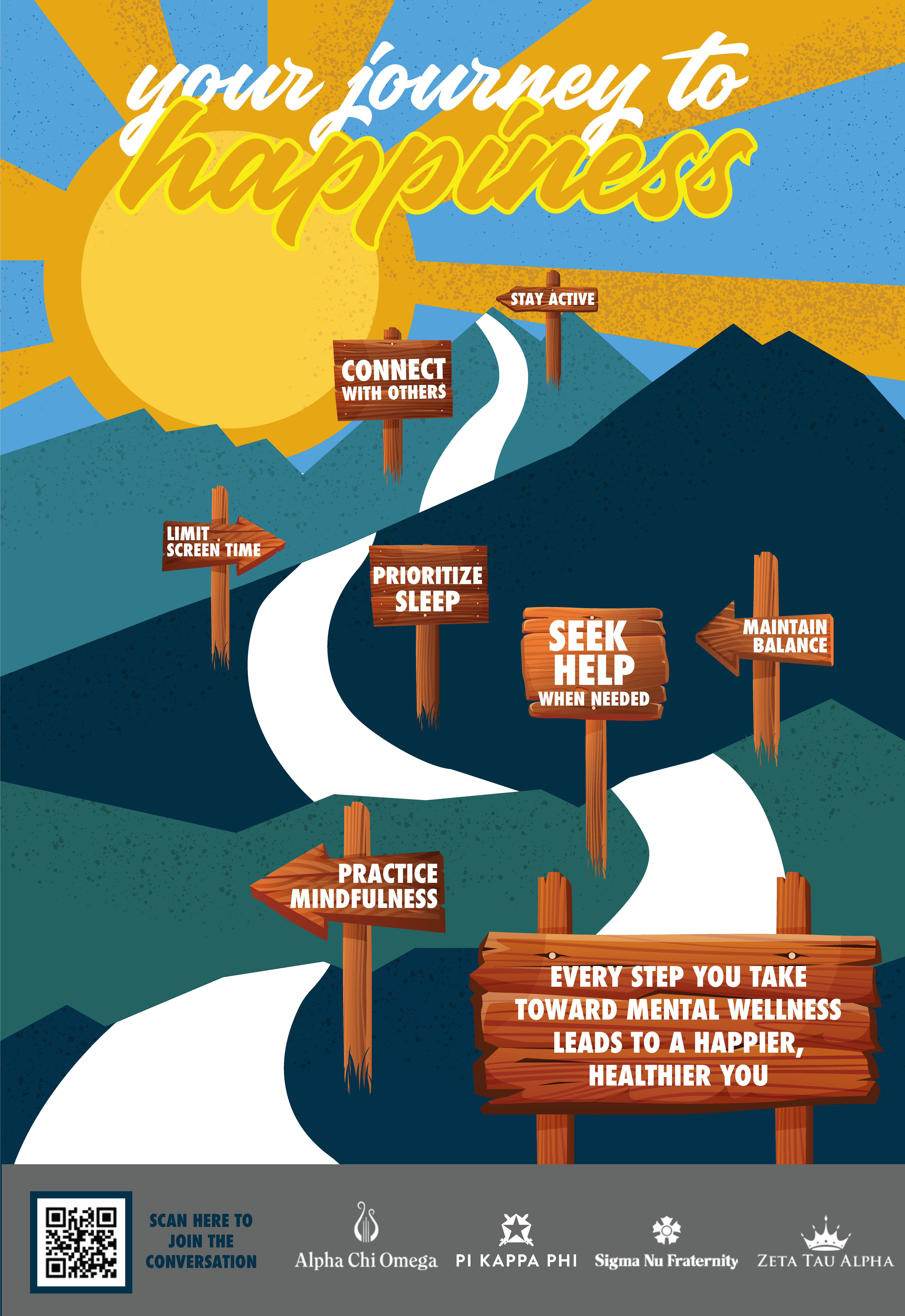 JOURNEY TO HAPPINESSMental wellness is not a destination — it’s a journey made up of everyday choices. This poster encourages members to take intentional steps to improve well-being and create healthy lifestyle habits. Highlighting practices like prioritizing sleep, staying active, limiting screen time and seeking help when needed, it serves as a visual reminder that every small action contributes to a healthier, happier life. Display this poster in a chapter space and use the conversation starter as part of programming events focused on mental health awareness.Journey to Happiness conversation starter |