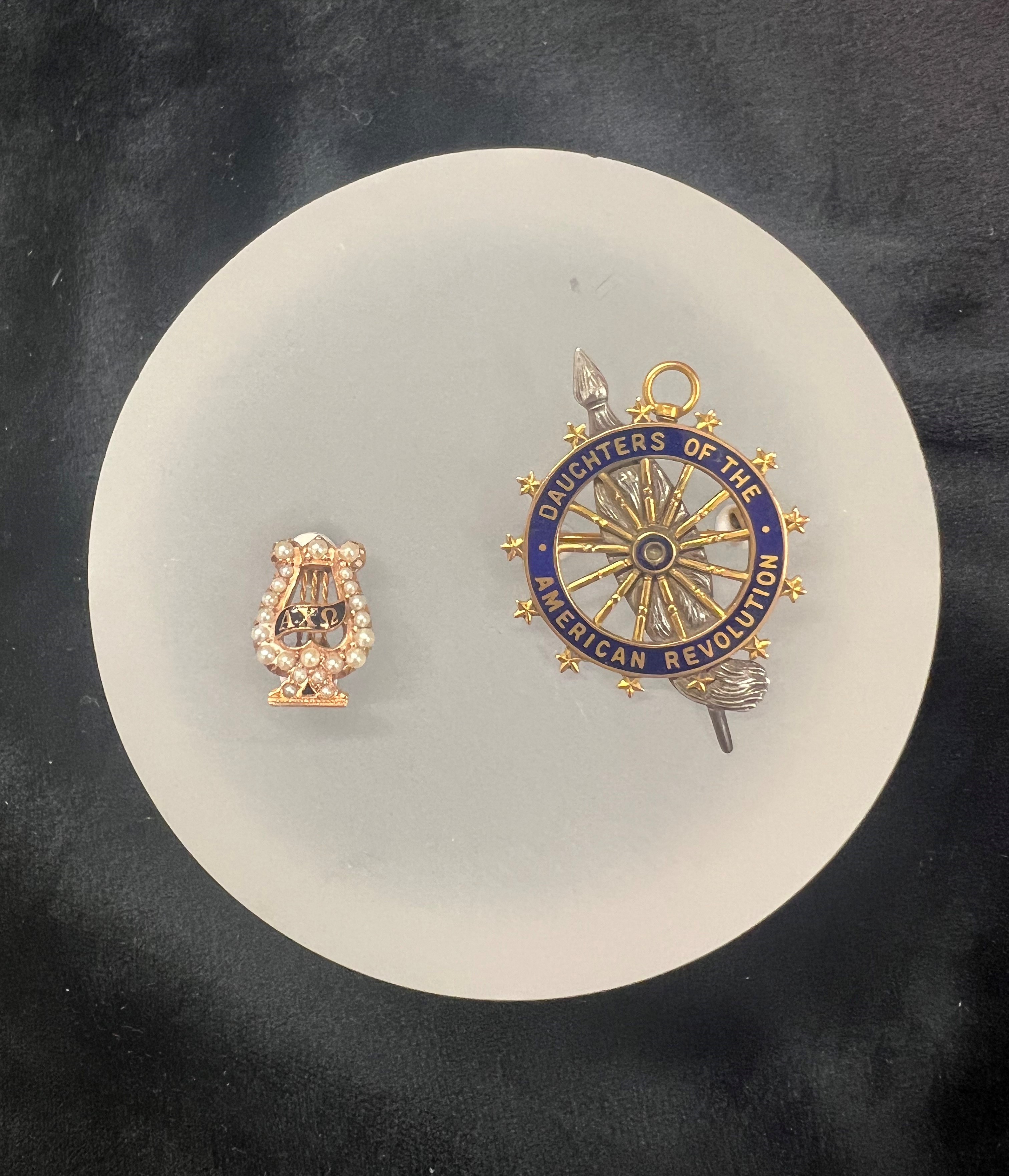 22 pearl gold badge, Daughters of the American Revolution pin (although not an Alpha Chi Omega jewelry item, still meaningful to Bessie and her family’s history)